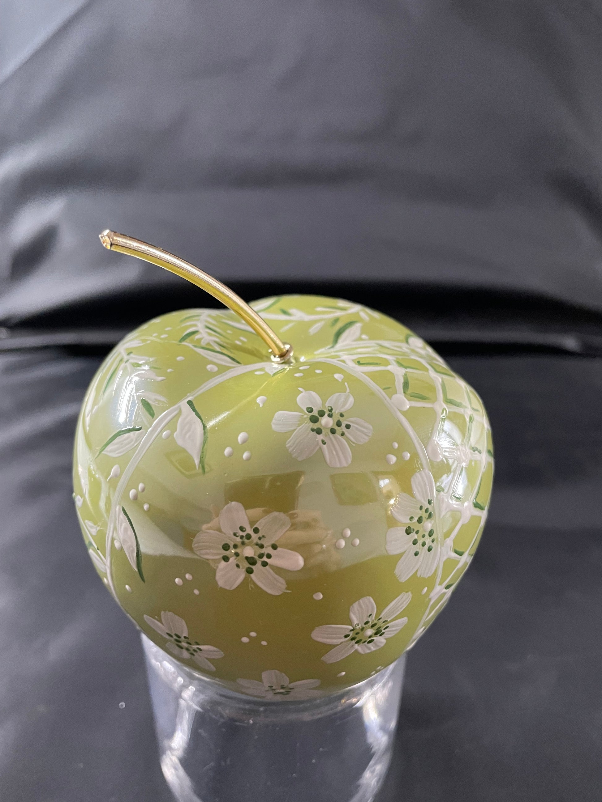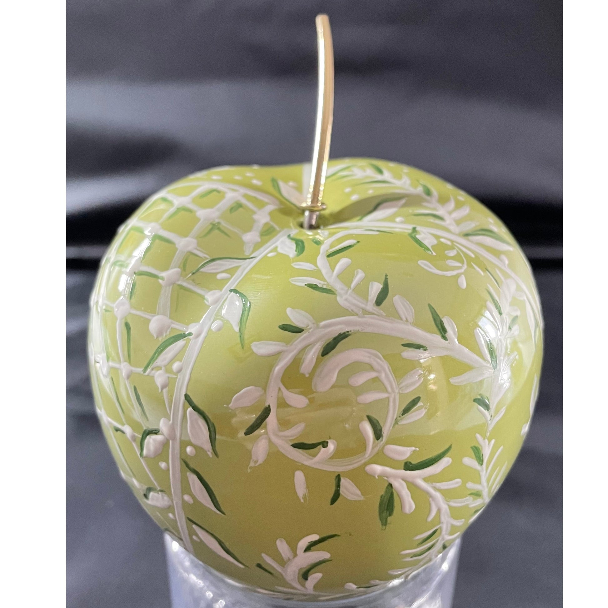 Mela in ceramica smaltata verde acido decorata a mano raffigurante patchwork fiori foglie e fantasia geometrica 9x9 cm